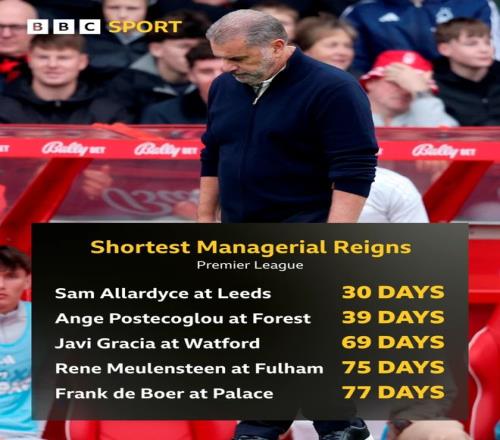 据BBC体育统计,波斯特科格鲁执教森林仅39天,是英超历史上(1992年至今)执教时间第二短的主帅,仅次于前利兹联主帅阿勒戴斯,后者在2022/23赛季末段执教利兹联仅30天即离任。