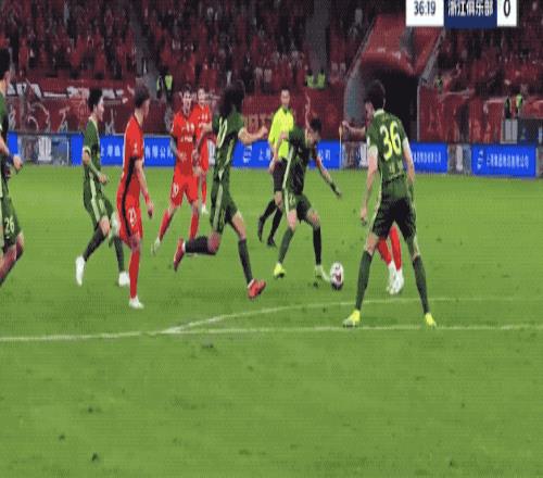 直到第35分钟,浙江队才完成了本场比赛的第一次射门,卡列洛30米开外突然起脚远射,皮球被蒋光太挡了一下,稍稍偏出。