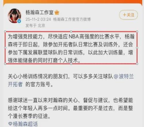 此外,杨瀚森工作室也最新发声,这一次下放之际小杨会正常参加开拓者比赛和训练,除此之外,小杨会参加发展联盟撕裂之城混音队的日常训练,以此增大训练量,增强体能,更好打磨个人技术。也要感谢球迷们的关心、督促和建议,也希望球迷们能给这个年轻人再多一点时间,整个漫长的赛季才刚刚开始。