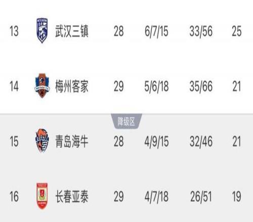 梅州和亚泰保级的唯一希望,就是超越青岛海牛,争取最后1个保级席位。不过他们已经完全没有主动权。2日15点30分,只要海牛在主场击败已经提前保级的武汉三镇,积分将达到24分,海牛就将提前送亚泰成为本赛季首支降级队。