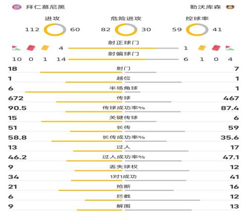 雷速体育11月2日宣 德甲第9轮,拜仁慕尼黑主场以3-0大胜勒沃库森。整场比赛里,拜仁在数据方面呈现着压倒性的态势,获得胜利实至名归。