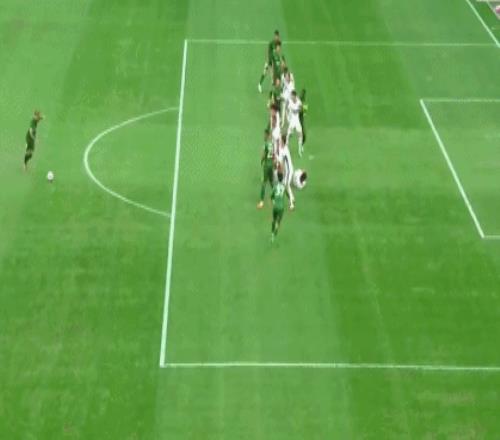 第18分钟,法比奥小禁区鱼跃冲顶,球击中远端门柱之后反弹入网,1比0!