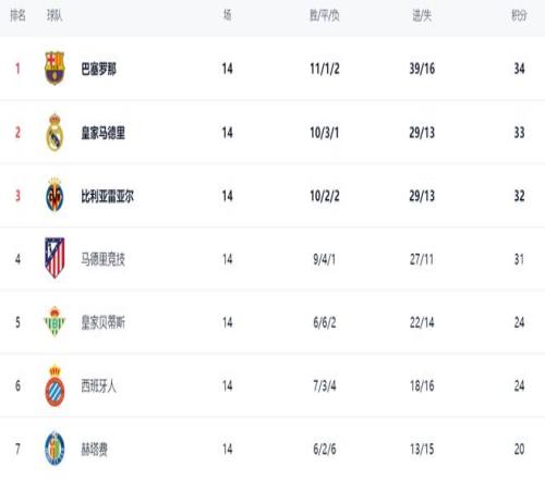 在积分榜上,巴萨依然占据榜首位置。巴萨11胜1平2负,拿到34个积分。而皇马因为这段时间频频丢分,无缘榜首位置,10胜3平1负的战绩,只拿到33分,屈居第2。第3的是比利亚雷亚尔,拿到了32分,排名第3。马竞9胜4平1负,拿到31分,排名第4。冠军的争夺非常激烈,前4最多只差3分,榜首随时都有可能易主。