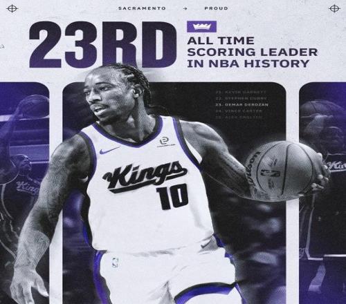 北京时间今日,萨克拉门托国王队在主场迎战丹佛掘金队。在比赛上半场,国王后卫德罗赞达成里程碑。