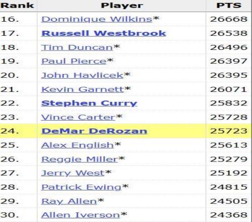 在德罗赞身前的是勇士球星斯蒂芬-库里,后者以25832分排名历史第22位,两人相差100分左右。