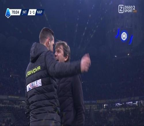 意甲第20轮一场焦点战,国际米兰主场2-2与那不勒斯握手言和。但下半场裁判判给国米的一粒点球引起了那不勒斯主帅孔蒂的强烈不满,他对裁判出言不逊被红牌逐出场外。