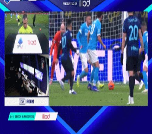 比赛进行到第70分钟出现了关键一幕,拉赫马尼在禁区内踩到了抢先一步的姆希塔良,主裁多维里当时并没有判罚点球,国米继续进攻,巴斯托尼的一脚射门打偏了。但随后VAR介入,提醒主裁回看这次犯规。