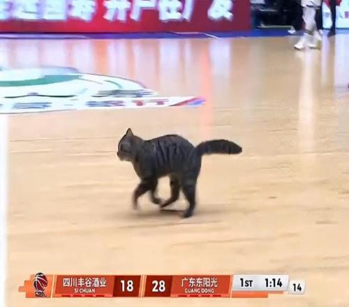 比赛第一节有一只很可爱的小猫咪误入球场。